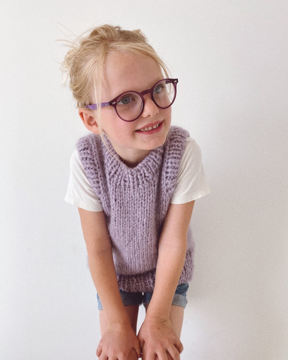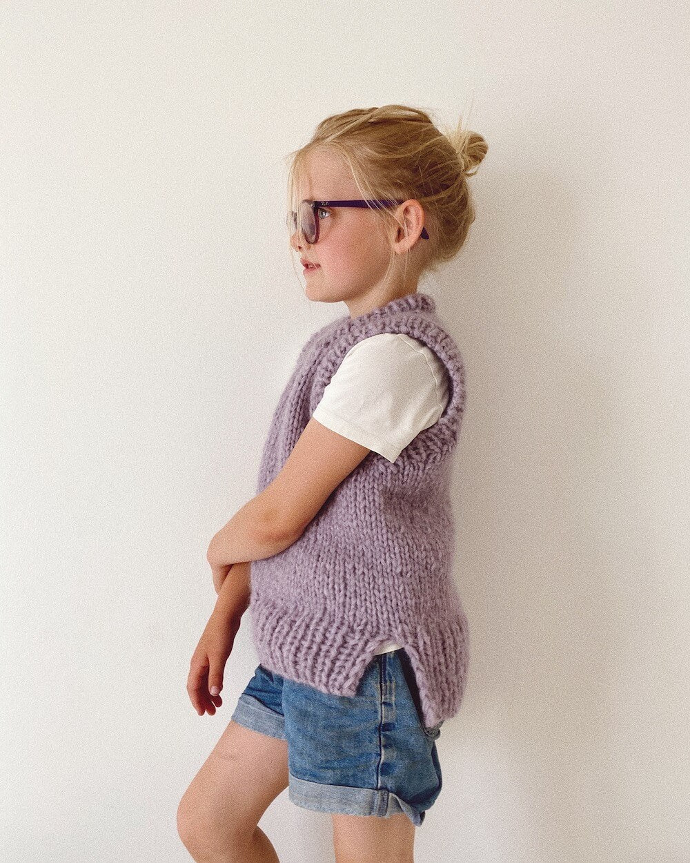 Lav en strikkeprøve inden du går i gang. Bemærk, at der strikkes med tre tråde (to af det tykke garn og en tråd silk mohair).