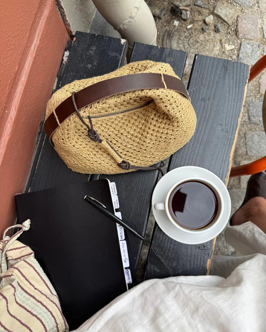 Juno Bag strikkes fra bunden og op i hulmønster. Taskens opslagskant ligger langs bundens midte. Bunden strikkes frem og tilbage i hulmønster, og herefter samles masker op langs bundens sider. Tasken strikkes herefter rundt i hulmønster. Øverst lukkes masker af i midten, mens der i hver side strikkes hank. Hanken strikkes rundt i hulmønster. Til sidst monteres lynlås, for og læderrem i tasken.