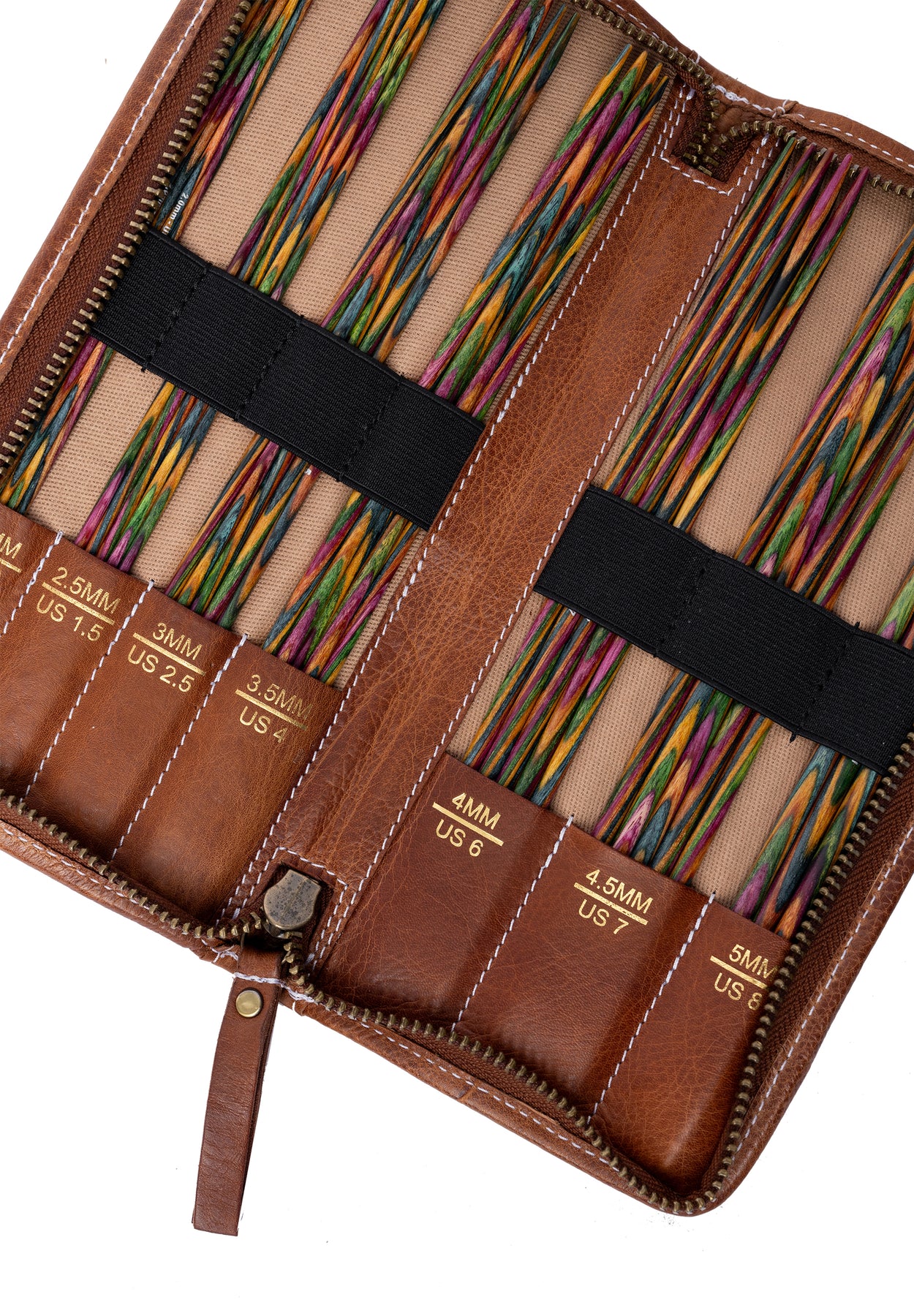 Project 102 er et smart og elegant læderetui, designet til at holde styr på dine korte strømpepinde på 20 cm 🧶✨