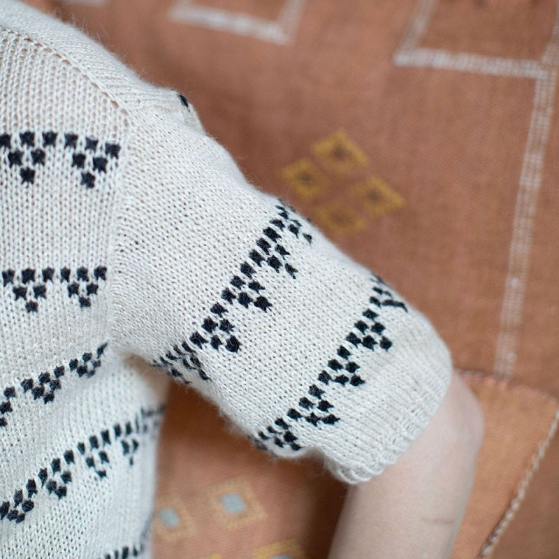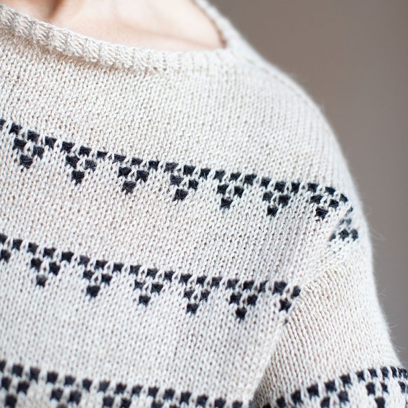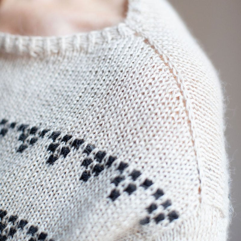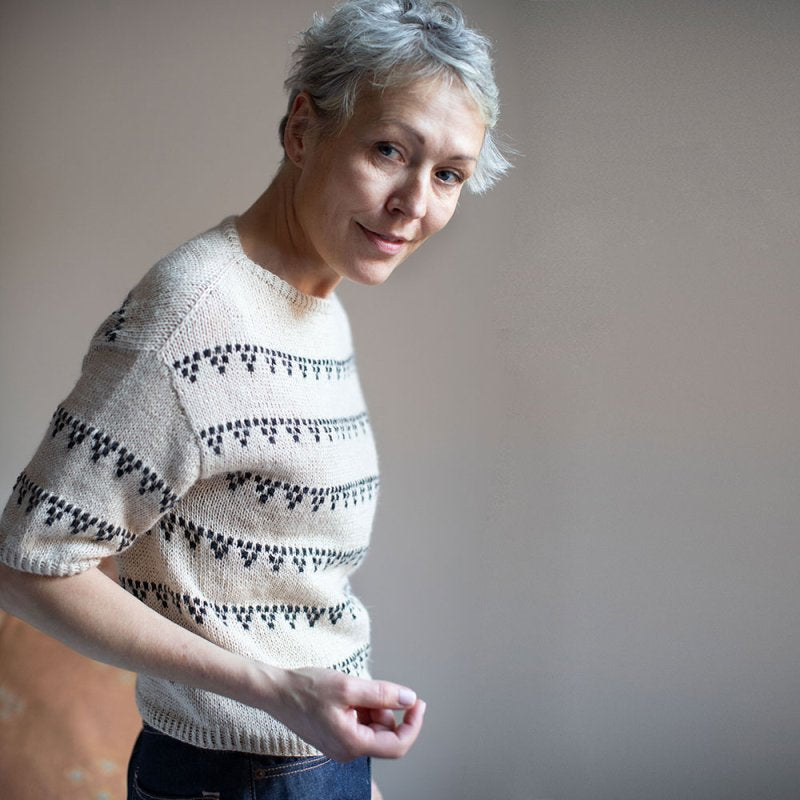 GRAPE TEE er strikket i glatstrik og et elegant mønster i vævestrik. Vævestrik er en enkel teknik, der gør det muligt at strikke et flerfarvet mønster, uden at strikke med flere farver